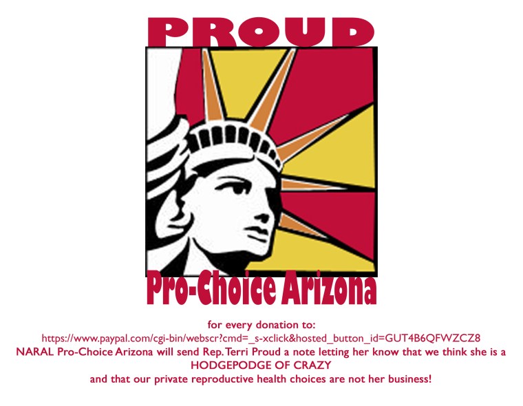 So the local chapter of NARAL Pro-Choice Arizona who sent out the Choice Action Network alert that the undistinguised Representative was responding to when she got all ugly has now issued a donation challenge: